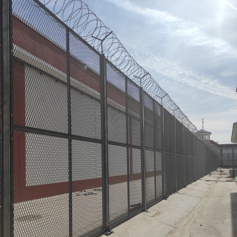 監獄圍欄網構造:首先把網片焊接在鐵管框架上,框架是方管或者圓管焊接成的框架構造,在框架上焊接用于個立柱銜接的銜接板,用防盜螺栓與立柱銜接。為了保證網片的防拆卸性能,網片銜接方式采用特制防盜緊扣件,有效避免人為的毀壞性拆卸。