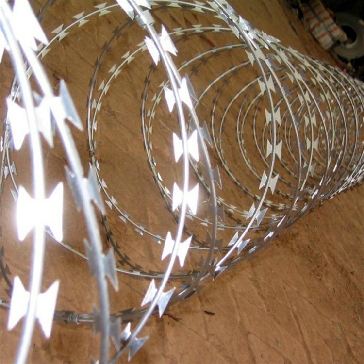 刺絲滾籠又名刀片刺繩,是由不同材質的鋼板沖剪出尖銳的刀片板帶包裹在不同材質鋼絲芯線上邊組合而成的,材質上邊可以選擇鍍鋅,噴塑或不銹鋼等常見的幾種。