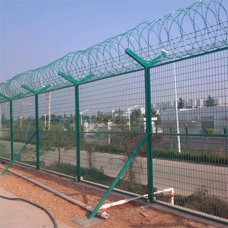 機場隔離網的支撐立柱頂部會焊接Y又型固定架。每個單臂45公分-50公分長,焊接兩個固定刺繩鉤。用來固定不銹鋼刀刺網。機場圍界隔離網和不銹鋼刀刺網搭配的好處有效防止防攀爬。頂部是帶刀片的加高刀刺網,下面是金屬鋼絲焊接隔離網墻。形成通透式的防攀爬隔離網墻。