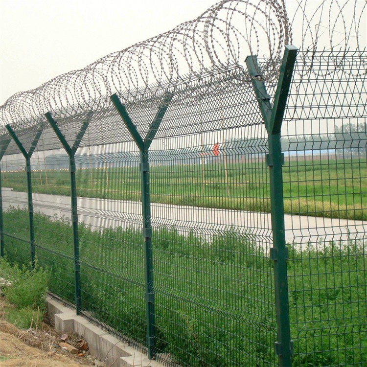 防爬Y型機場圍界網頂部裝有刀片刺絲和刀片刺繩,安全保護功能將得到很好的加強。其產品外形美觀,顏色多樣,不僅起到圍欄的作用,還起到美化的作用。Y型機場圍界網可以電鍍、熱鍍、噴涂、浸塑等防腐形式,具有良好的抗老化、防曬、耐候等特點。艾瑞根據用戶需求生產各種規格和尺寸的Y型機場圍界網產品!