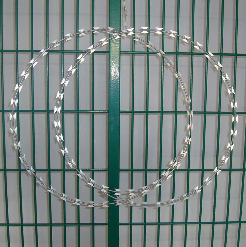 咱在具體分析一下到底刀片刺網和刀片刺繩都是什么產品。刀片刺繩很容易理解,就是帶刀刺的條形物,不管是直的還是螺旋的都類似繩子的形態,古稱之為刀片刺網。刀片刺網,何所謂網,你得成面還得有邊有孔,能過濾一些東西才能稱之為網,沒孔的那就是板了。所以刀片刺繩或焊接或通過其他手段鋪成一個面之后就是刀片刺網。經過我上面的分析大家很容易就在大腦中形成圖像了,刀片刺繩是組成刀片刺網的基礎,刀片刺網是刀片刺繩的高級形態。