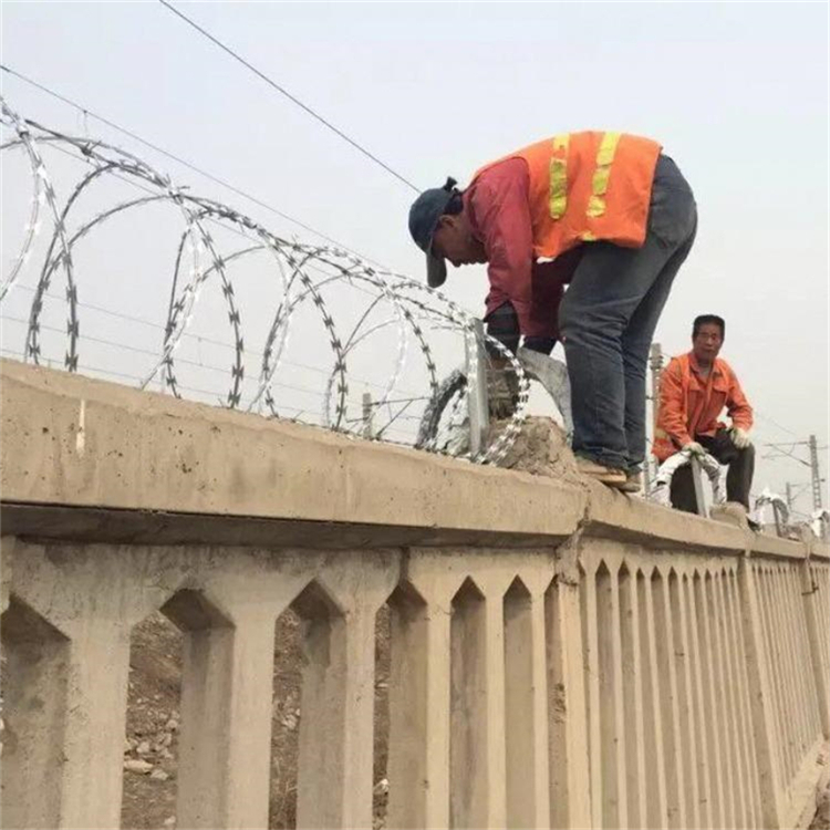 (3)304不銹鋼蛇腹型刀刺網(wǎng)用4根直徑3mm的不銹鋼鋼絲繩固定在Y型立柱部位,拉絲和刀刺用均直徑1mm的不銹鋼絲或?qū)S每劾υ喂?,不晃?dòng)。
