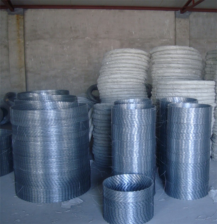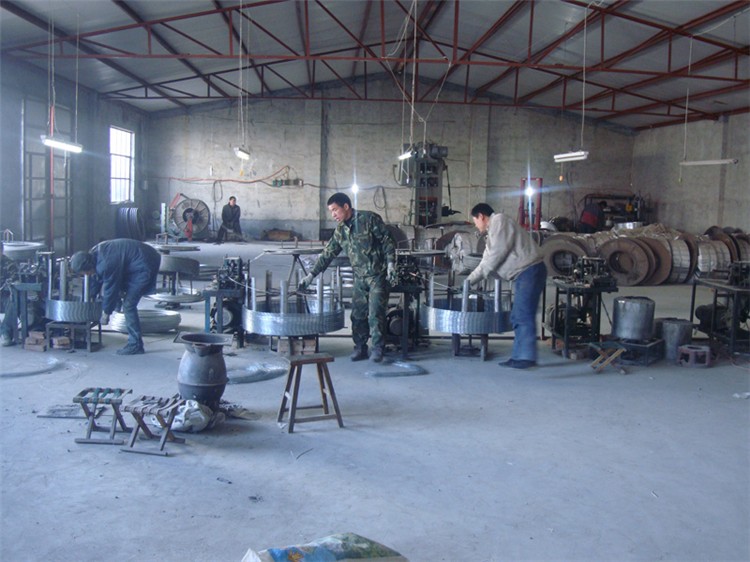 熱鍍鋅刺絲滾籠制造工藝:刀片刺絲刺籠采用刀片刺繩在預先調整好徑向尺寸為500mm的滾筒上由上至下繞圈,在纏繞指定的圈數后自動停機待令,盤成的繩卷移交下一工序進行上卡扣。卡扣在周向均勻地臨圈交替固定3排,張拉開來以后為蛇腹型刀片刺網。加工制作完成后,先包裹一層硬質紙,再包裹一層編織網,壓包后存放在成品區準備提貨。