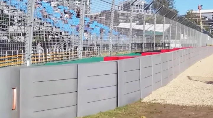 在護欄的選擇和擺放上,撞擊角度是我們需要考慮的重要因素之一,我們可以把賽車的能量分解到兩個方向上,平行于護欄的和垂直于護欄的。分解其中一個方向的能量,我們可以盡量避免護欄的形變并強迫賽車沿圍墻滑行,用摩擦力使其減速?;炷磷o墻就極其適合這種情況,因為它堅固且不易移動,而車手也不會想正面撞上混凝土,所以它雖然不適合吸收垂直方向上的能量,但它很適合利用摩擦力吸收動能,分解掉水平方向的能量。