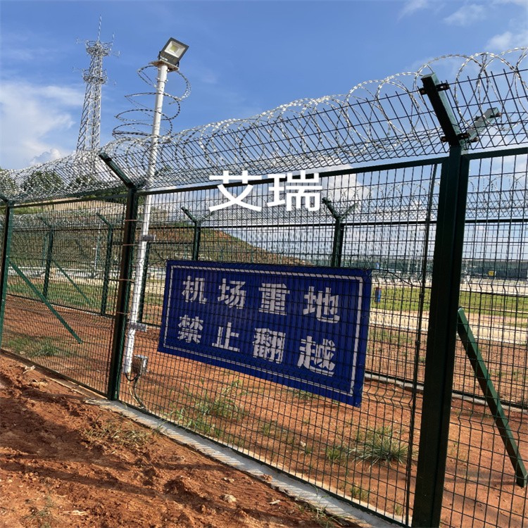 在機場護欄網頂部加裝刀片刺絲、刀片刺繩后又很好的增強了安全防護性能。采用電鍍、熱鍍、噴塑、浸塑等防腐形式,雙層防腐,提高產品的使用年限。機場金屬隔離網產品造型美觀、花色多樣,既起到圍欄作用,又起到美化作用。由于具有安全性高、防攀爬能力好等特點。
