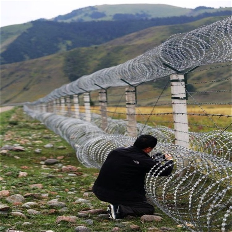 邊境鐵蒺藜防護網是刀片刺繩制作成螺旋狀網,是在兩條刀片鐵絲網之間以不銹鋼片和鍍鋅鋼片強力夾扣,展開后即呈交叉狀,美觀又實用,卷經大小可供選擇,圈數也可供選擇,大小均可定做,具有防腐、防老化、抗曬、耐用等特點,防腐蝕,比一般鐵絲使用壽命更長,這種封控蓋板鐵絲網是日常生活中常見,也是應用的防護鐵絲網,直線型邊防護邊鐵絲網有多種架設方式可供選擇,施工迅速,既省經費,又可達到嚇阻的效果。護邊鐵絲網防腐、防老化、抗曬、耐候等特點。防腐形式有電鍍、熱鍍。國界護邊鐵絲網是用帶刺的木樁和鐵絲等構筑而成,移動式鐵絲網是由工廠成批生產后運至戰場地臨時設置,直徑是70-90厘米,長10米左右,設置速度快,抗破壞強度高,能遲慢汽車裝甲車等車輛的行動。 提起鐵絲網,人們通常會聯想到戰場、邊境線等特殊場景。的確,鐵絲網一經發明,就被廣泛應用于軍事和防御工程,而今在和平年代里,鐵絲網的應用也很廣泛。