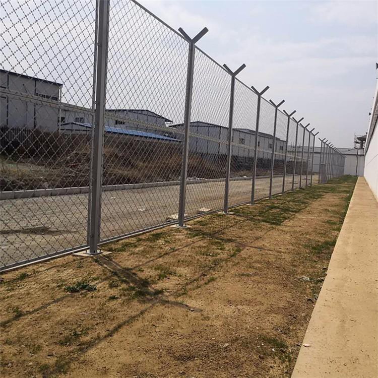 監獄刀片刺焊接網一般頂端都設有V型支架與立柱焊接。材料通常選擇和立柱同等材料或者稍小規格材料搭配使用。V型支架的加裝是為了將蛇腹形刀刺網固定在鋼網墻頂部,從而有效的增加監獄鋼網墻的防攀爬性和安全性。