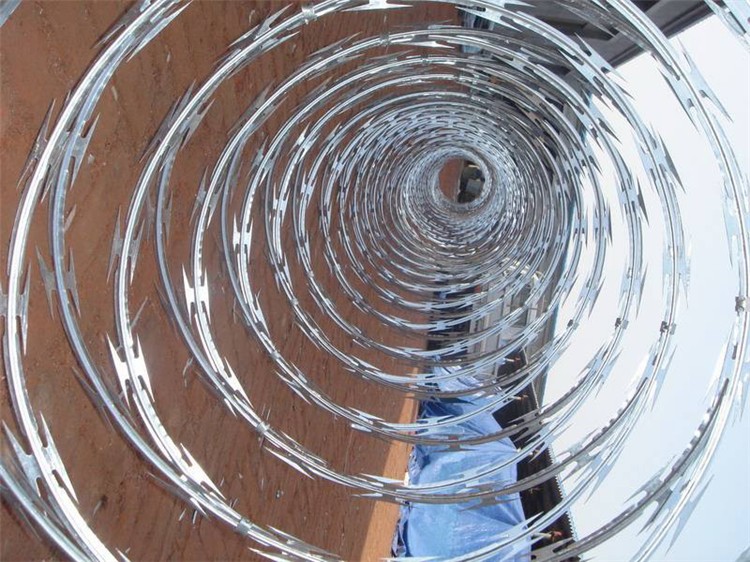 圍墻倒刺鋼絲網(wǎng)的直徑一般是50公分和60公分。我廠備有大量現(xiàn)貨,當(dāng)天可發(fā)貨。刀片刺繩為熱鍍鋅鋼板經(jīng)過沖壓而成的刀片形狀的防護(hù)網(wǎng),圈經(jīng)為50厘米,螺旋覆蓋長度為10米-12米。