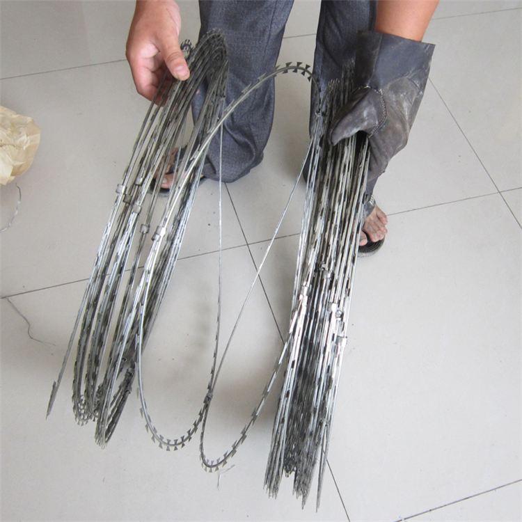 刀刺滾籠生產工藝 :刀片刺繩由熱鍍鋅板或不銹鋼薄板沖壓出尖銳的刀片狀,高張力鍍鋅鋼絲或者不銹鋼絲做芯線組合而成的防護產品,利用不銹鋼卡扣將刀片刺繩繞圈后相臨兩圈每隔120°用刺絲連接卡固定,張開后形成蛇腹網狀,閉合后刀片刺繩 圈徑為50cm,張開后每交叉圈安裝間距20cm,直徑不小于45cm。由于刺網造形獨特不易觸摸、形成立體圍護因而能達到極好的防護隔離效果,該產品具有嚇阻效果好、美觀、施工便利、線型可隨地勢變換、經濟實用等優異特點。