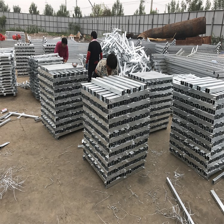 矩形鋼管上部焊接掛鉤采用長度30mm絲徑5mm冷拔鋼筋制作,加密支架采用同樣與立柱支架的矩形鋼管制作,表面進行熱鍍鋅處理,鍍鋅量270g/㎡。 階梯支架與立柱支架相應(yīng)采用材料一致,只是高度為1005mm,普通立柱支架為730mm,一般3m間距中間按一處加密支架以增牢堅固性。